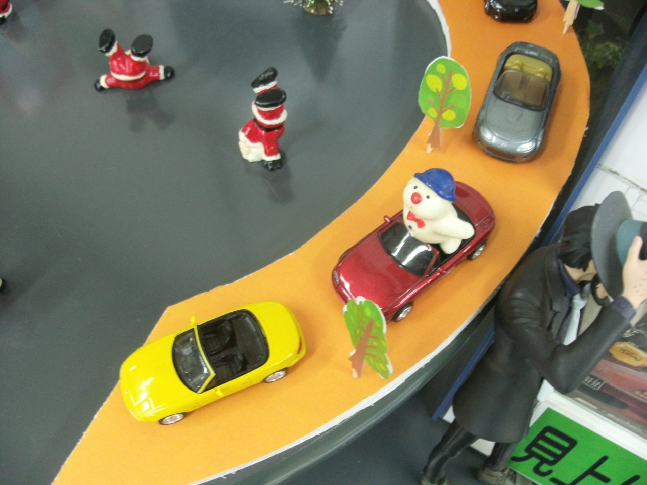 今年は新しい試みで、ロードスター軍団との「コラボ」まさに、サンタフェスタ!(*^-^*)新しく作成したミニカーのロードスターのディスプレイを変えた所へ、おふざけサンタと、スノーマンの「乱入」です。('◇')ゞ